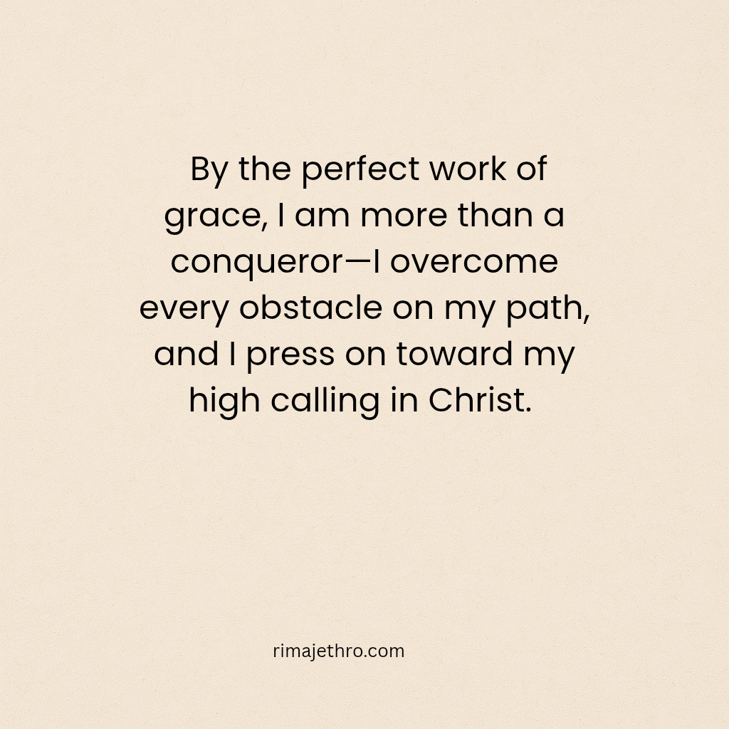 9. By the perfect work of grace, I am more than a conqueror—I overcome every obstacle on my path, and I press on toward my high calling in Christ.