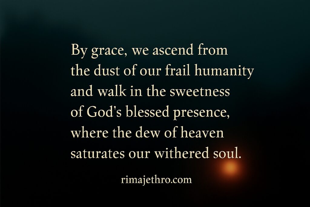 22. By grace, we ascend from the dust of our frail humanity and walk in the sweetness of God’s blessed presence, where the dew of heaven saturates our wildered soul.