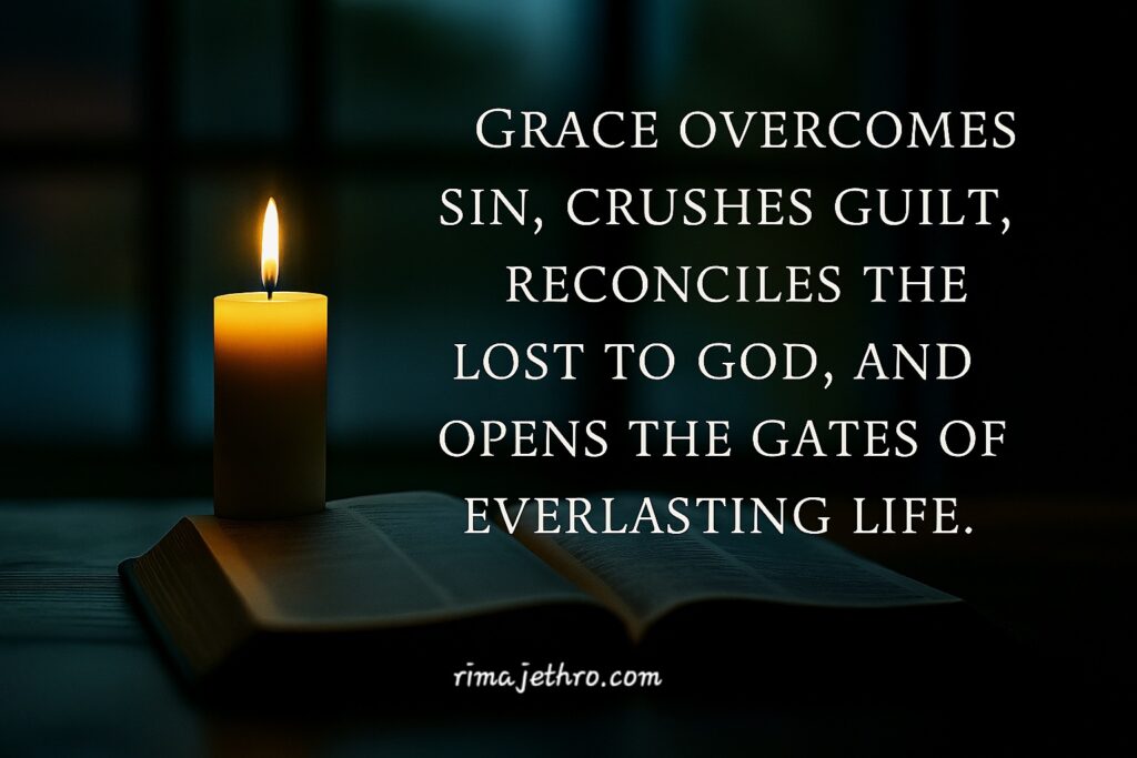 4. Grace overcomes sin, crushes guilt, reconciles the lost to God, and opens the gates of everlasting life.