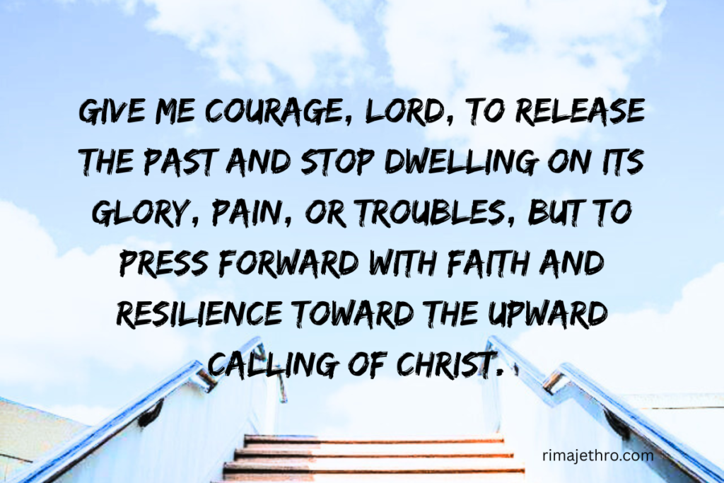 Lord, You said, “Remember ye not the former things, neither consider the things of old. Behold, I will do a new thing; now shall it spring forth; shall ye not know it? I will even make a way in the wilderness, and rivers in the desert. (Isaiah 43:18-19), please do something new in my life today—open new divine doors, opportunities, and provisions beyond human comprehension. Give me courage, Lord, to release the past and stop dwelling on its glory, pain, or troubles, but to press forward with faith and resilience toward the upward calling of Christ.