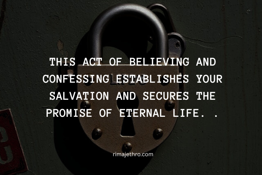 Believe in your heart the gospel of Jesus Christ—that through His death alone you are saved and reconciled to God—and confess with your mouth that He is your Lord and Savior. This act of believing and confessing establishes your salvation and secures the promise of eternal life. That if thou shalt confess with thy mouth the Lord Jesus, and shalt believe in thine heart that God hath raised him from the dead, thou shalt be saved. For with the heart man believeth unto righteousness; and with the mouth confession is made unto salvation. (Romans 10:9-10)