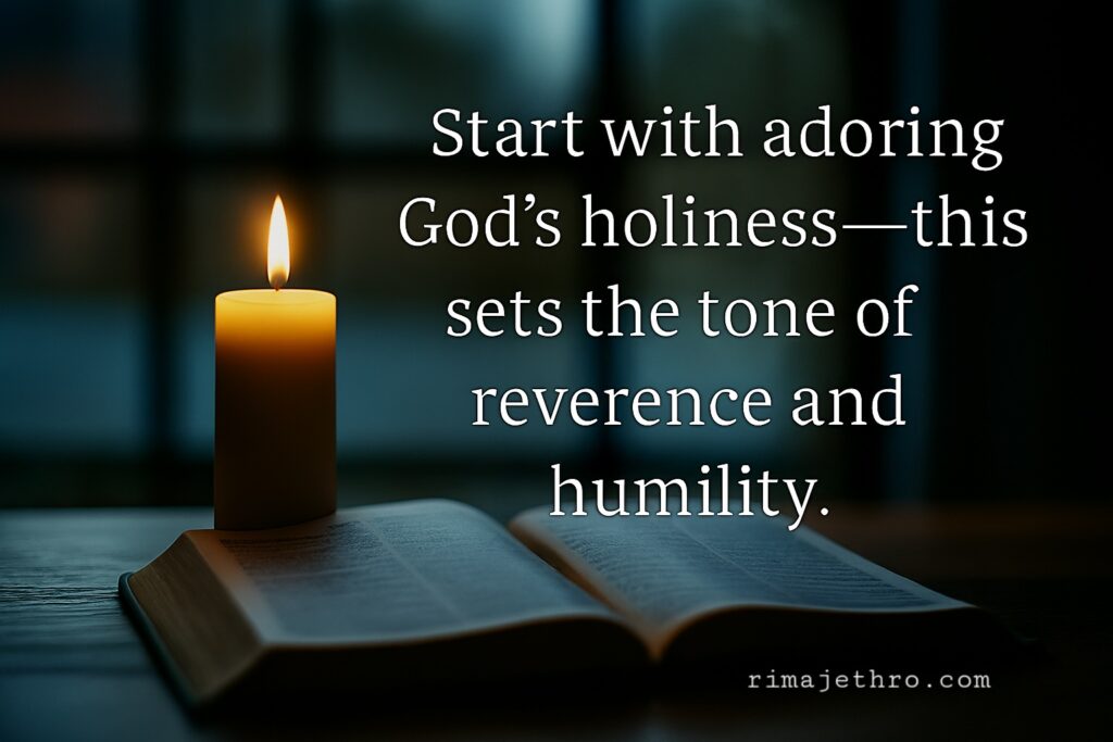 Start with adoring God’s holiness—this sets the tone of reverence and humility. We enter into God’s presence with thanksgiving—for what He has done or yet to do, then we proceed to bless and praise Him for who He is. Enter into His gates with thanksgiving, and into His courts with praise: Give thanks unto Him, and bless His name. (Psalms 100:4).
