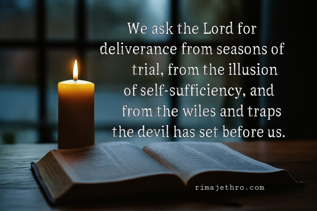 This is an earnest plea for guidance and safety. We ask the Lord for deliverance from seasons of trials, from the illusion of self-sufficiency, and the wiles and traps the devil has set for us. God is always there to deliver us. Who delivered us out of so great a death, and will deliver: on whom we have set our hope that He will also still deliver us. (2 Corinthians 1:10).